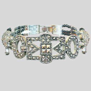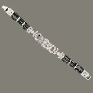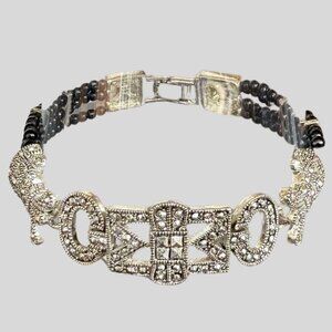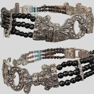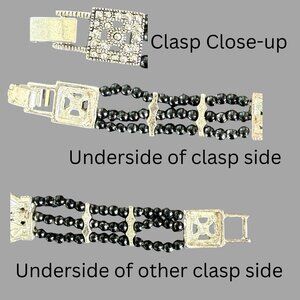 This Art Deco style bracelet features a detailed silver tone centerpiece with raised beading and geometric cutout design, paired with triple rows of glossy black beads for a bold vintage inspired look. The foldover clasp closes securely, and the piece sits beautifully on the wrist with a fixed length of 7.5 inches. Preowned with light surface scratches on the clasp, but no missing stones or structural issues. In stock and ships from the USA.