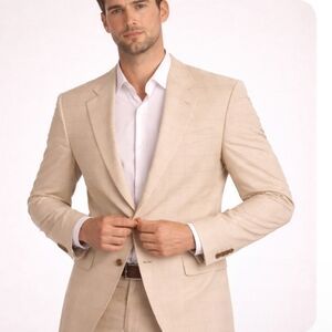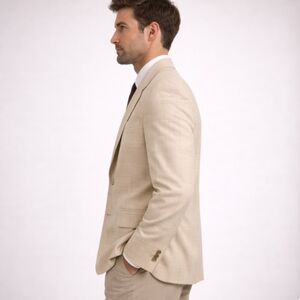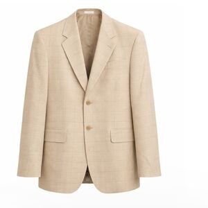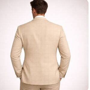 Designed in a soft beige tone with a subtle windowpane check, this tailored piece features classic notch lapels, structured shoulders, and a timeless silhouette that transitions effortlessly from business to elevated casual wear.