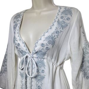 Mo Haun Yi Chu White Bell Sleeve High-Low Babydoll Boho Embroidered Dress;