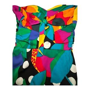 Multicolored flower-print silk-blend crepe strapless dress with a ruched bodice. The dress has a sweetheart neckline, lightly padded cups, a self-tie bow at back and a concealed zip fastening at side.