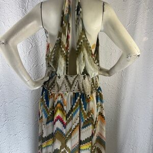 This stylish dress features a vibrant multicolor chevron pattern, perfect for any occasion. The dress combines a variety of colors for a bold and eye-catching look.
