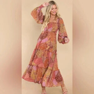 AURA maxi dress patchwork boho rust long sleeves smocked paisley stretchy