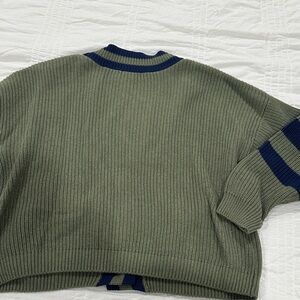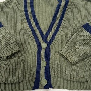 Cozy green cardigan with navy stripes. Features button closure and front pockets. Perfect for layering.