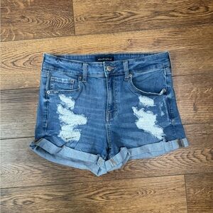 Trendy ripped jean shorts with cuffed hem. Perfect for casual wear.