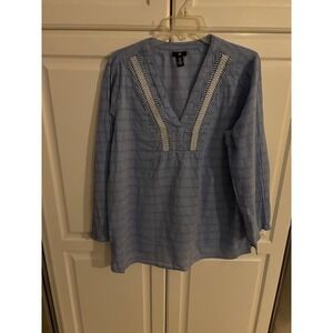 Gap Blue Plaid V Neck Embroidered Tunic Top Long Sleeve Women's XL