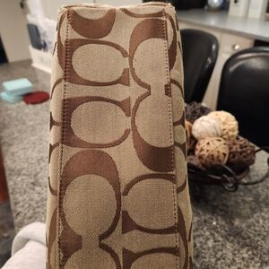 Adorable Coach tote with signature pattern. Brown body with pink accents. This bag is in good pre-loved condition. It has some wear on handles and corners as pictured. It is a great every day bag with lots of life left!