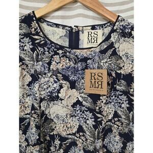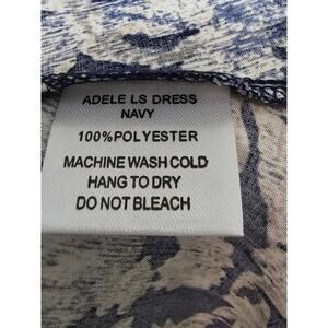 The Rossmore Adele Dress is a new, small-sized dress with a blue, cream, and tan floral pattern. It features long bell sleeves and a flare design, with a zip closure and a see-photo neckline. Made of polyester with no stretch, it has a short dress length and is suitable for casual occasions in the summer, fall, and spring. The dress is branded by Rossmore and is not vintage. Its style is mini and its theme is flower, 70s, 90s, and long sleeve.