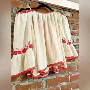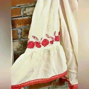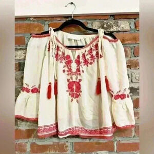 Gorgeous off white, sheet blouse with hot pink embroidered detail. Blouse ties at the shoulder with extra tassle detail. Lace detail around the neckline, sleeves, and the bottom of the blouse.