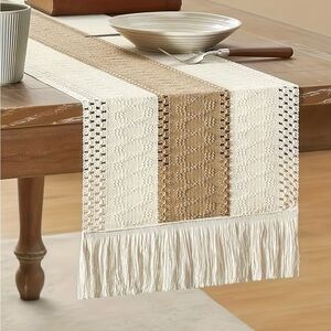 Neutral Boho Woven Table Runner with Fringe – Farmhouse Décor