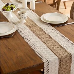 Brand new woven table runner featuring a beautiful neutral color palette of ivory and natural tan. The textured center panel and delicate fringe trim give this piece an elevated boho-farmhouse look that works perfectly in modern, rustic, or coastal interiors.