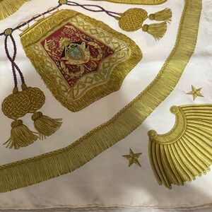Elegant Hermès silk scarf featuring a luxurious gold and cream design. Hermès "Poste et Cavalerie" silk scarf, designed by Joachim Metz and first issued in 1986. Perfect for adding a touch of sophistication to any outfit. Please look at pictures as part of description and ask questions.