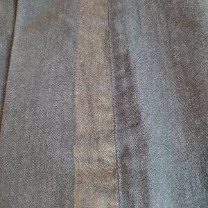 The jeans are a dark navy blue color with a darker black 1" wide printed stripe down the side seams.