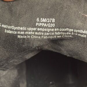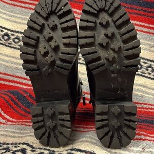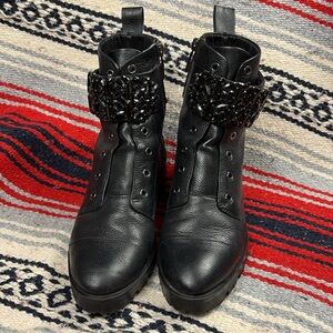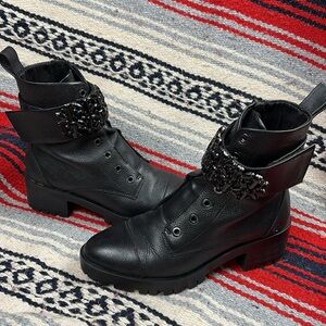 This gently used boot has a wide embellished ankle strap with a combat style cut and heel.