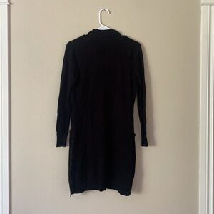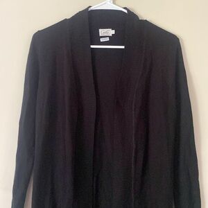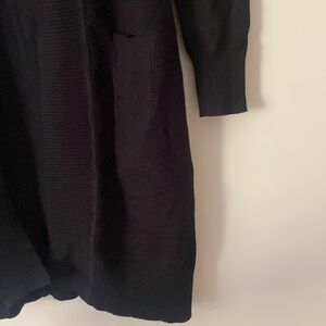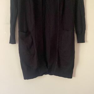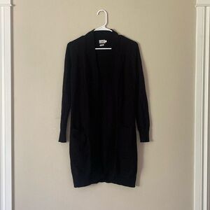 Long and thin! This is a perfect cardigan for your closet. It's good to wear with a pair of jeans and boots and also to wear with dressy pants and a simple undershirt. The extra large pockets and long length of the cardigan are great features to keep you comfy all day long!