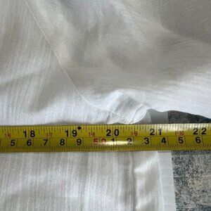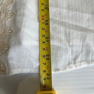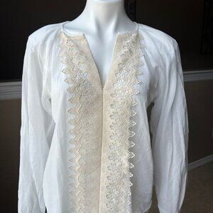 Round collar blouse with V-neck front and long sleeves. Matching front crochet detail.