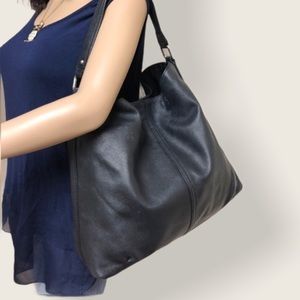 Kooba Hobo style shoulder bag. It has a soft black pebbled leather exterior, silver tone hardware and black nylon lining. There are two main compartments that are divided by a giant zipper pocket. There are two slip pockets and one zippered pockets that are on the sides. It measures 13” tall 15” wide 4” deep at the base. Strap drop 7”. Excellent clean condition.