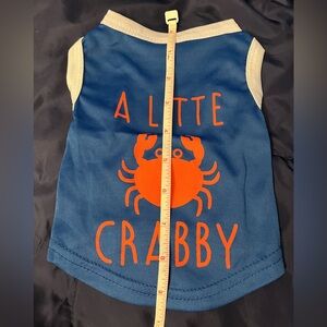 Fun blue pet shirt featuring a vibrant orange crab and playful text.