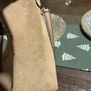 preloved. Suede needs cleaning.Bottom of purse corners needs cleaning and there is some rubbing Inside lining has some small pen marks. Underneath handles show a little rubbing. see pictures for details on condition. first two pictures from internet smoke free home.