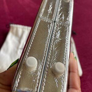 New with tags. Sold-out silver metallic cracked leather colorway — no longer available on the Brandon Blackwood website. Structured trunk silhouette with signature B buckle closure. Fits all phone sizes. Can be worn top-handle or crossbody.