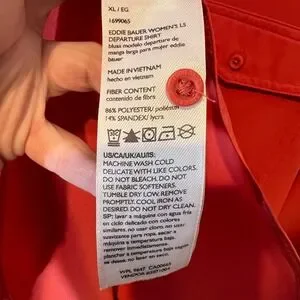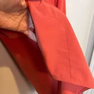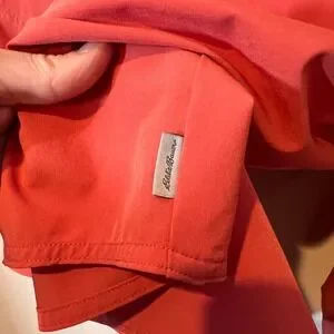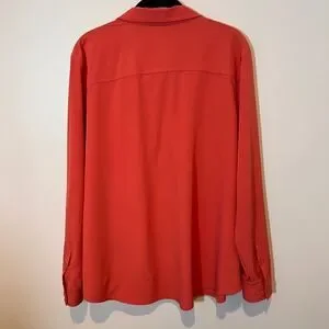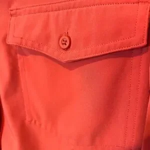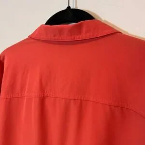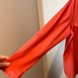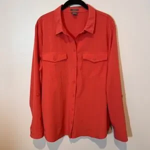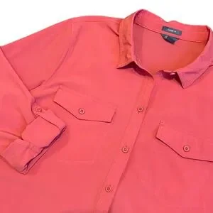 This shirt is a beautiful coral color and is in excellent condition. It has 2 chest pockets that button, roll tab sleeves, full button down the front, a collar for extra sun protection, it's very light weight, and it has a stash pocket in the side seam for essentials. Great stretch.