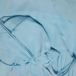 FOREVER YOURS aqua strapless pleated bodice bridesmaid dress Size 12. Measurements in pictures. Sash has been added. Spaghetti straps and matching bag are included. New with tags - has NOT been altered. Strapless Neckline, Sleeveless, Backless, Zipper, Zip up, Chiffon, Knee Length. Similiar to Davids Bridal color Malibu and JJ's House Pool or Ocean Blue.