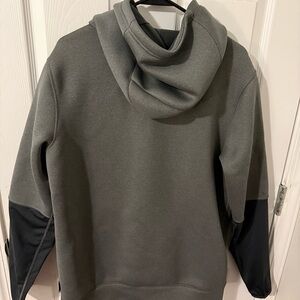 Nike hoodie with sleek design. Features gray body and black sleeves. Comfortable and stylish.