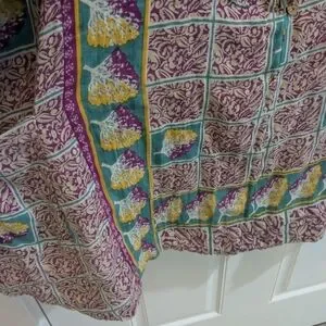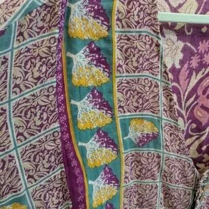 Embrace bohemian style with this floral patchwork kimono top. Featuring a blend of purple and green hues, this top adds a vibrant touch to any outfit. There is a small area of splitting on the back of the neck.