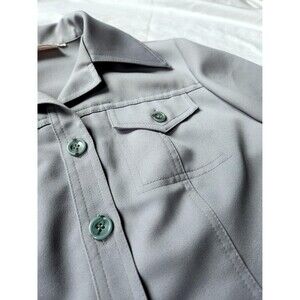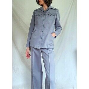 Decked out in Disco era details, this slick little set is tailored in mid-weight, cool gray poly knit with ultra high-rise, perma-pressed, wide leg flares, Talon zip, classic spread collar jacket, top-stitching, flap chest pockets, inset curved hip pockets, a yoked bodice, and cute aqua blue marble buttons.