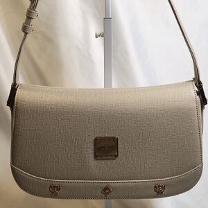 MCM shoulder bag in cream. Features gold hardware. It has an adjustable strap for versatility as a shoulder bag or cross body. This gorgeous bag is in excellent pre-loved condition. There are no scratches on the hardware. There are no rips or tears. Includes unbranded dust bag.