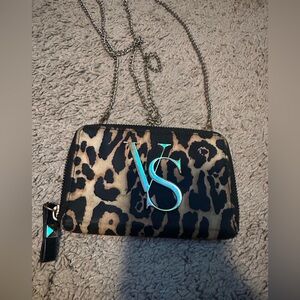 Chic leopard print bag with silver chain strap. Features bold VS logo. Perfect for a night out.