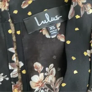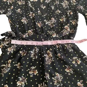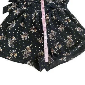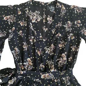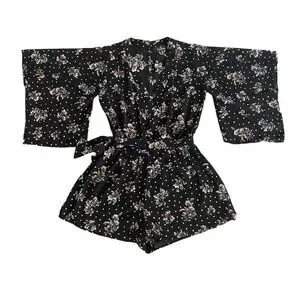 Take a glamorous journey in the Lulus Midnight Voyage Black Print Romper! Beige, brown, and sage green floral print and metallic gold polka dots decorate this chiffon romper with a surplice bodice, plunging neckline, and wide, kimono sleeves. Banded waist, with elastic at back and tying detail at side, tops attached shorts. Back keyhole with two top buttons.