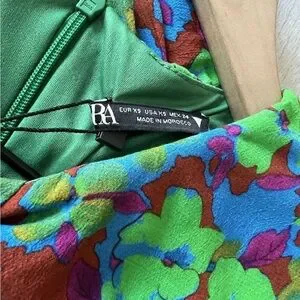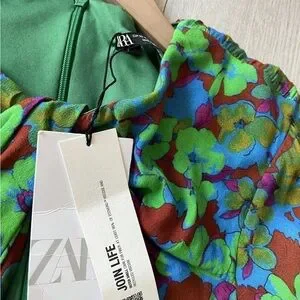 This is a brand new Zara mini dress in size XS made of 100% viscose material. The dress features a green, red, and blue floral pattern with an open front and sheath style. It is perfect for women who want to look stylish and comfortable at the same time.