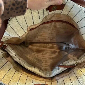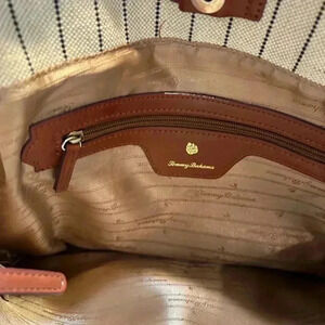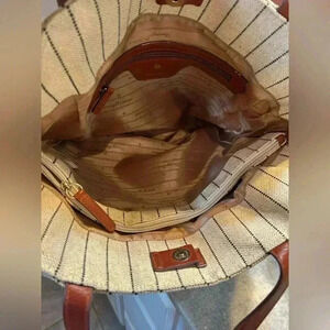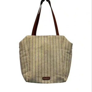 Excellent like new condition Gleaming floral embroidery and crisp pinstripes detail this textured linen tote trimmed in tawny faux leather.