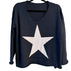 Cozy and stylish navy blue sweater featuring a bold white star design. Perfect for casual outings and adding a touch of flair to your wardrobe.