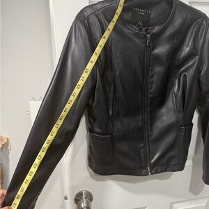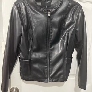 Chic black leather jacket by Zara. Perfect for a stylish look. Ideal for any occasion.size small