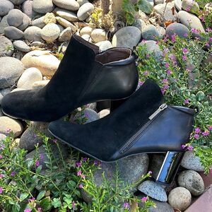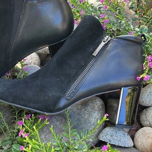 An embossed leather and suede block heel with gleaming silver-tone plate, adds a touch of elegance to this pair of booties from Donald J Pliner. Side zip fastening and cushioned sole. Like new and only worn once, comes with the original box. Fits true to size.