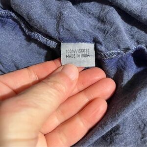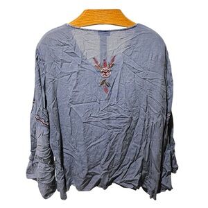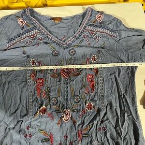Chic blue blouse with detailed embroidery. Features floral patterns and ruffled sleeves. Ideal for stylish occasions. Note: picture with chest measurement makes it look like there is fading in the top but this is just from the lighting and the rayon material. Size 2X, in good preowned condition.