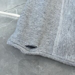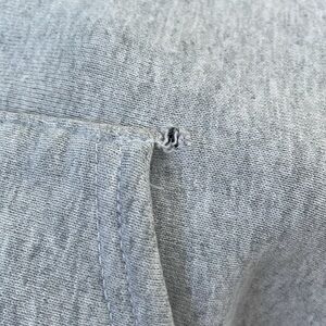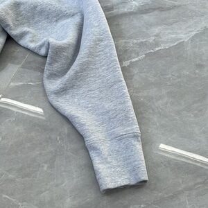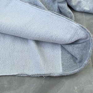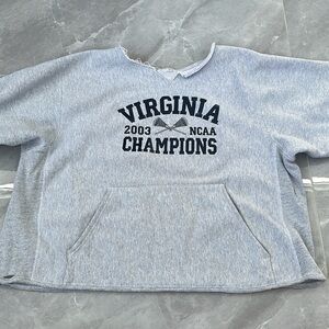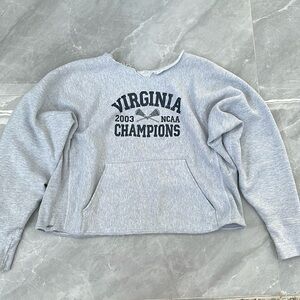 Okay condition - distressed University of Virginia 2003 NCAA Lacrosse Champions sweatshirt. Some alterations were made: hood cut off, v neck cut into neckline, and waistband cut off. Small hole near the top of the pocket and medium hole on right side of the sweatshirt (as pictured). Small stain on left arm (as pictured). Colors: gray and navy blue. Size: L (no size tag, but fits like a large).