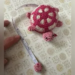 Adorable handmade turtle tape measure in pink and cream. Perfect for pet lovers and craft enthusiasts.