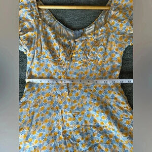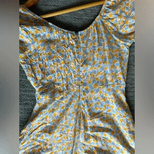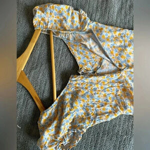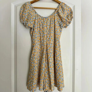 Full Tilt Blue & Yellow Floral Romper size Small. Zips in the back, ties in the front. Has pockets. 100% rayon.