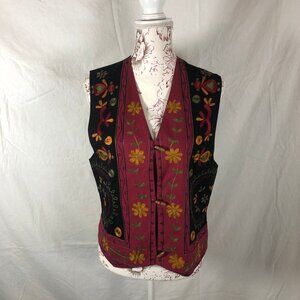 Vintage Lizwear Embroidered Floral Vest - Artisan Boho Statement Piece, Made in India Step into the artistry of the 1990s with this vintage Lizwear embroidered vest, a timeless piece that blends bohemian charm with global craftsmanship. Hand-embroidered floral motifs in gold, saffron, & moss green bloom against a rich cranberry red & black base, showcasing the meticulous detailing that made Lizwear a beloved heritage label.