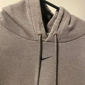 Vintage Nike Grey Middle Swoosh Hoodie. Size Large. Features a drawstring hood and front pocket. Ideal for everyday wear.