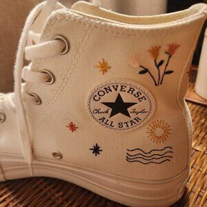 The Converse Chuck Taylor All Star Platform “It's Okay To Wander” Sneakers in size 10 are a stylish and versatile choice for women. Featuring a high-top design and ivory color, these sneakers have a classic Converse Chuck Taylor All Star silhouette with a platform sole for added height. The canvas upper material and athletic type make them perfect for casual wear, while the stars theme adds a fun and trendy touch to the shoe. Released in 2022, these sneakers are a fashionable and comfortable option for everyday wear.