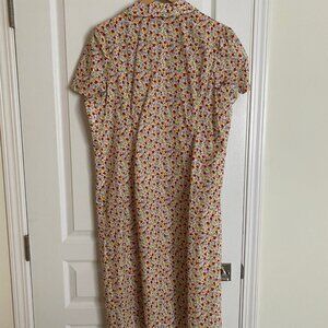 This is a lovely dress, short-sleeved midi dress with beautiful floral print. Shawl collar, fastens with mother-of-pearl buttons.