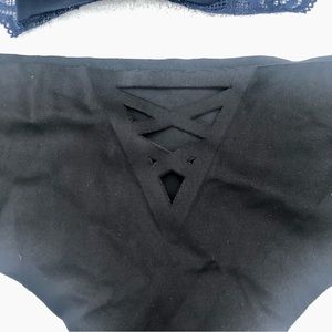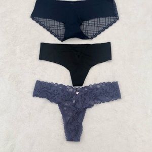 New with tags Victoria Secret three pair of panties. One blue lace thing, one solid black soft thong and one solid in the front sheer pattern back panty.