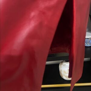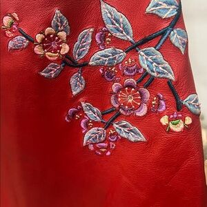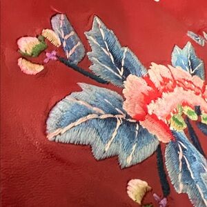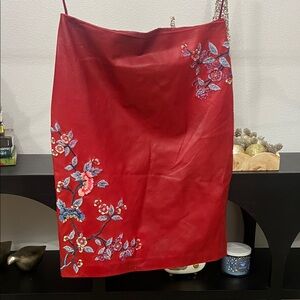 Elegant red swim cover-up with floral embroidery, perfect for a stylish beach day.