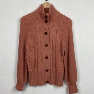 J.Crew S Cardigan - Cable Knit - Salmon Pink - Standing Collar - 55% Lambs Wool - Excellent preloved condition - Minor pilling - See pictures for details - Size Small