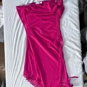 Keywords: Bear Dance, mesh dress, ruched dress, one shoulder, hot pink, midi dress, cocktail dress, party dress, evening wear, night out, concert dress, feminine, bold