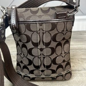 This Coach mini crossbody bag features the signature Coach logo print on durable brown fabric, offering a classic and stylish look that pairs easily with everyday outfits. Its compact silhouette makes it perfect for on-the-go use.