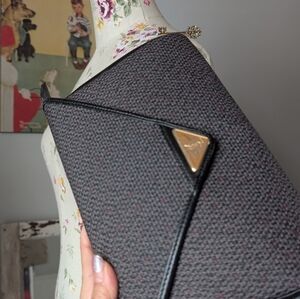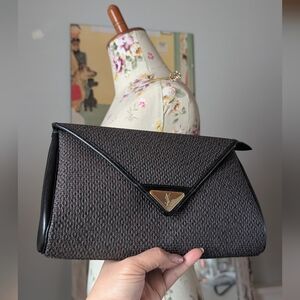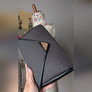 This clutch bag features a PVC body with leather trim, a top flap with a magnetic snap button closure, one large interior compartment, and an interior zip pocket. Very Good Condition, Clean inside and out, no foul smell